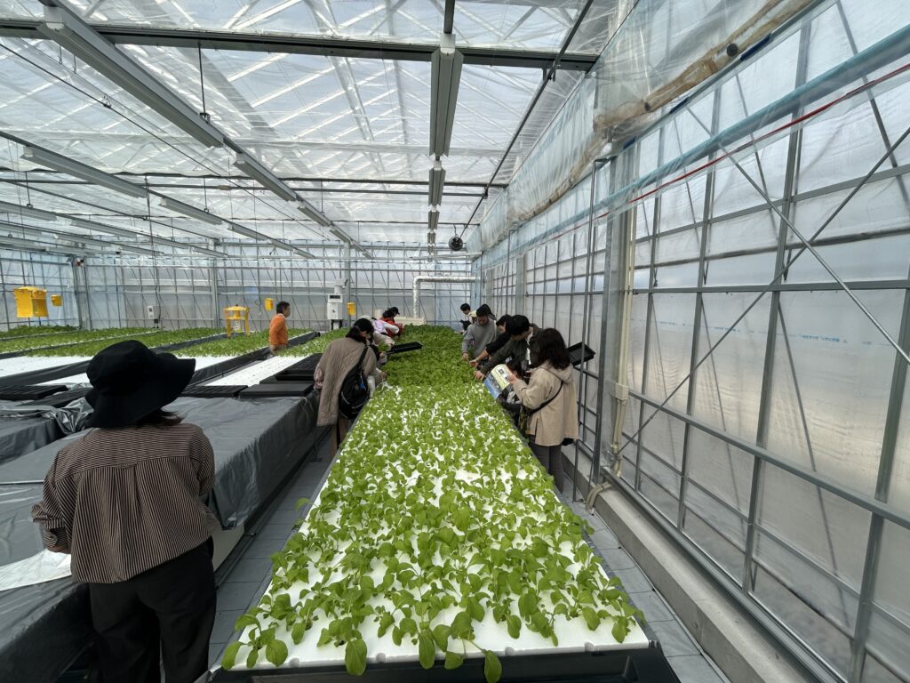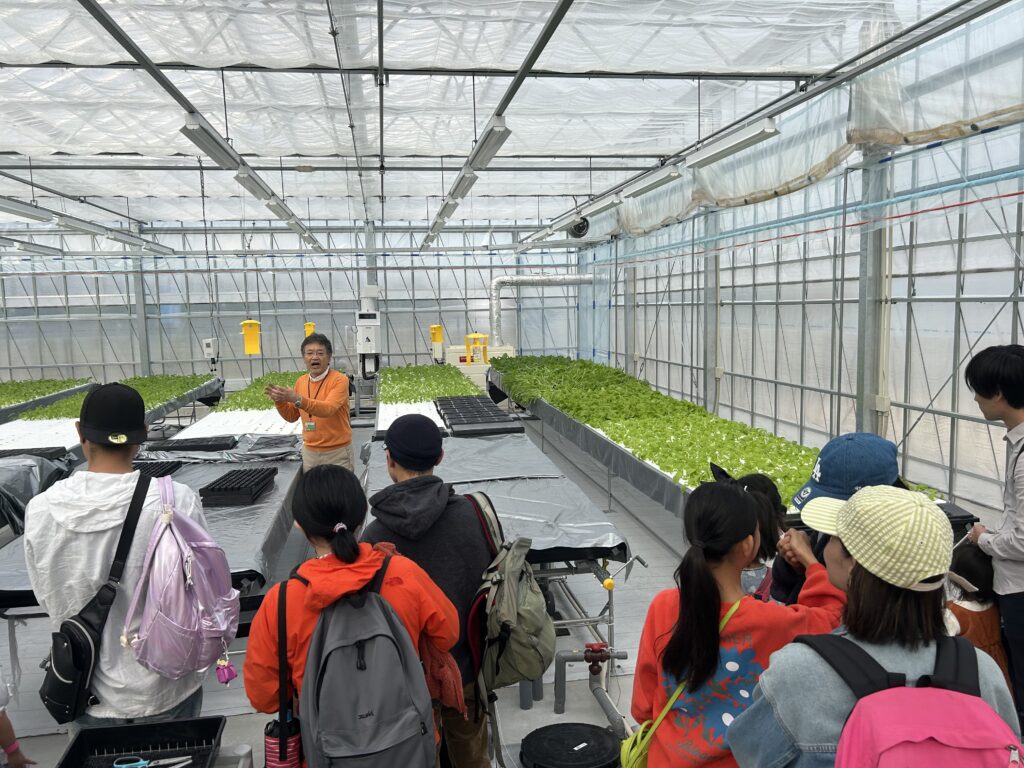 当日は、果菜棟、葉菜棟の説明をバイオ環境学部佐藤特任教授にしていただいた後に、野菜の収穫体験を実施しました。収穫した野菜はレタス、小松菜、水菜の3種類です。参加者の皆さんには、近未来の農業を触れていただきました。