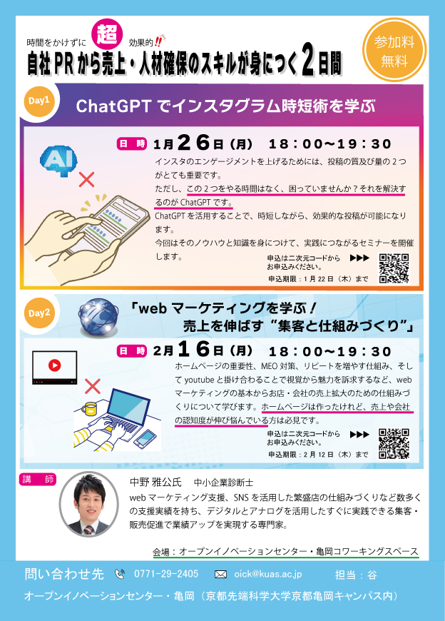 時短で効果を上げる2日間、webセミナーを1/26(第1回目)と2/16(第2回目)を開催します。